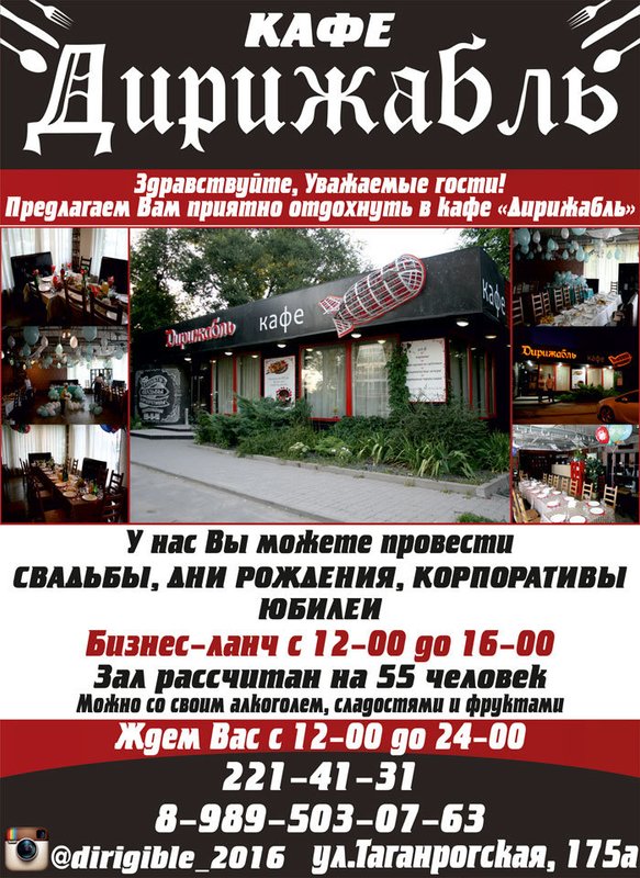 Наше заведение - кафе Дирижабль - это бар. У нас вы можете провести время за общением в компании или просто по-настоящему расслабиться после утомительного рабочего дня, а в этом вам с удовольствием помогут наши отменные бармены и ассортимент алкоголя. Вам посоветуют напитки по вкусу и кошельку! Вам нужно только сообщить крепость и вкус, состав или производителя. Мы уверены, что кружка любимого хмельного напитка точно украсит вечер и поднимет настроение!